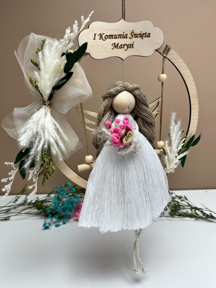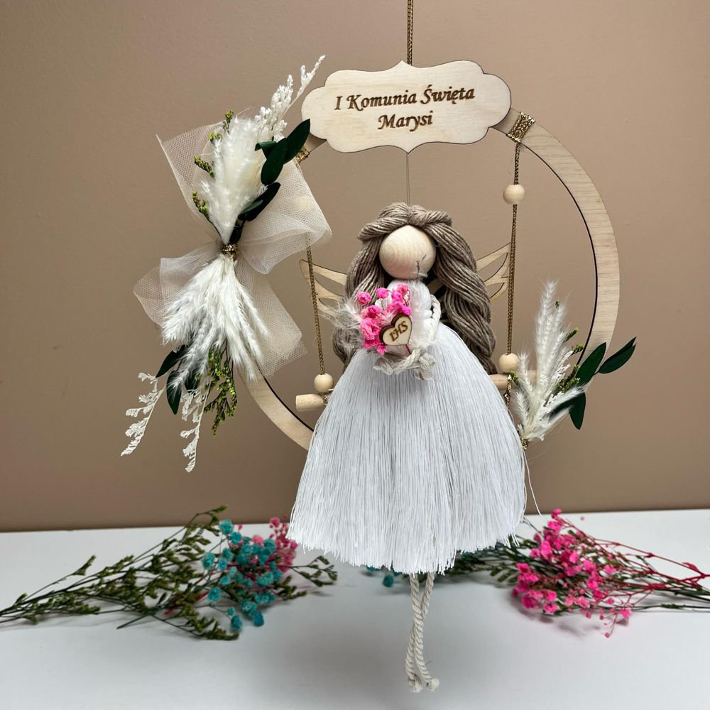Szukasz niepowtarzalnej pamiątki z okazji Pierwszej Komunii Świętej? Personalizowany aniołek w obręczy na huśtawce to doskonały wybór! To wyjątkowy prezent komunijny dla dziecka, a także piękny sposób na podziękowanie dla chrzestnych i dziadków.