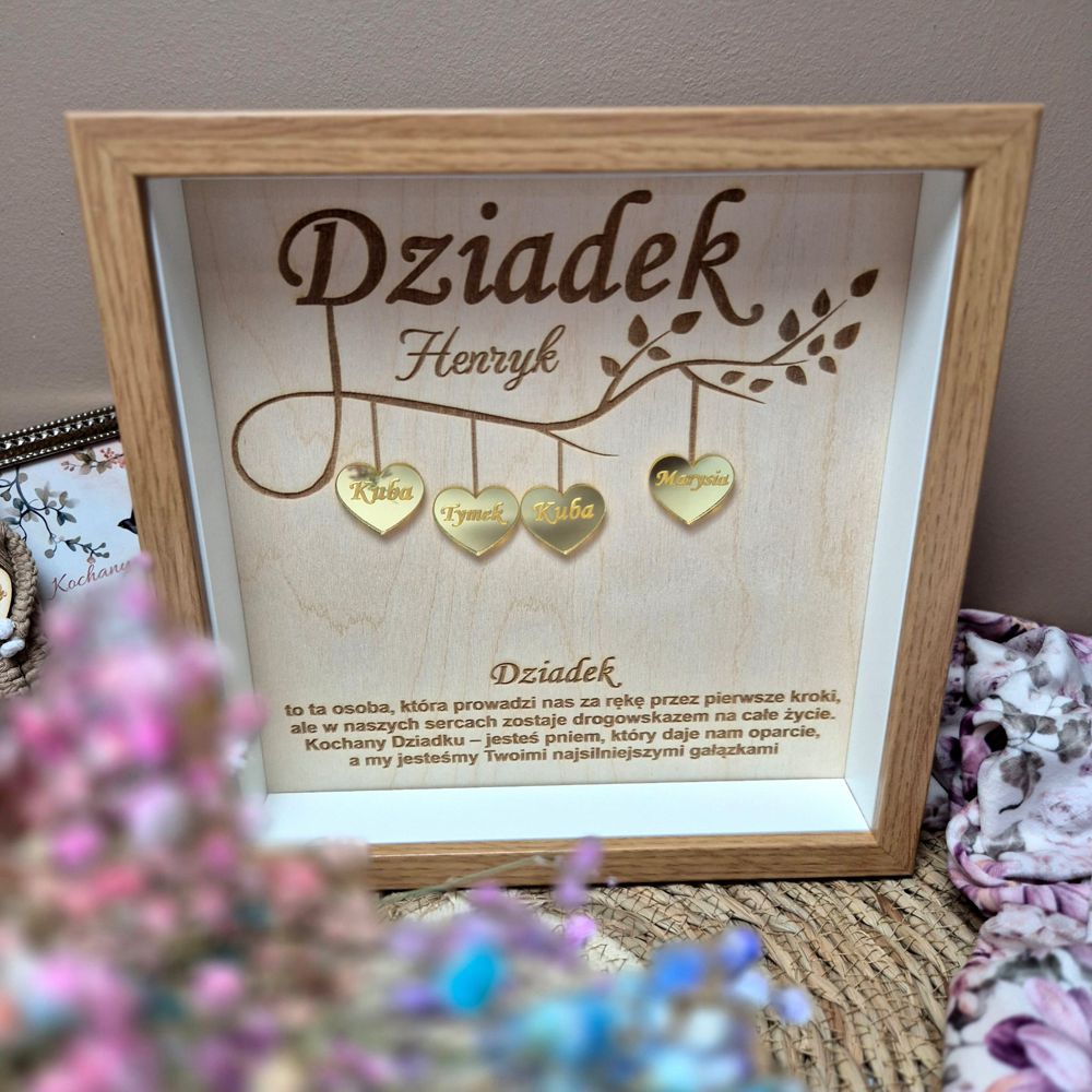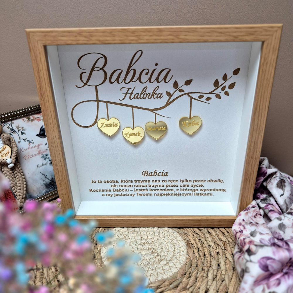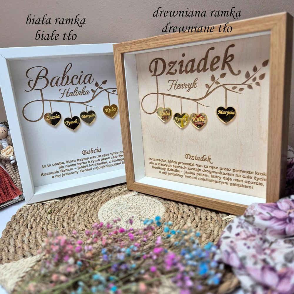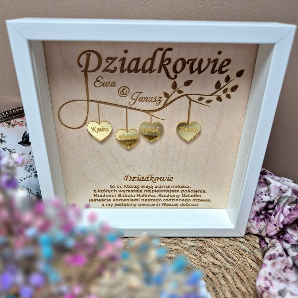 Elegancka ramka 3D z grawerem, zamknięta za szybką, z personalizowanymi złotymi serduszkami z imionami wnucząt oraz dedykacją dla Babci i Dziadka. Dostępne 2 kolory ramek (biała, dąb) oraz 2 tła (jasne drewno, biały HDF). Idealny prezent na Dzień Babci i Dziadka oraz inne okazje.