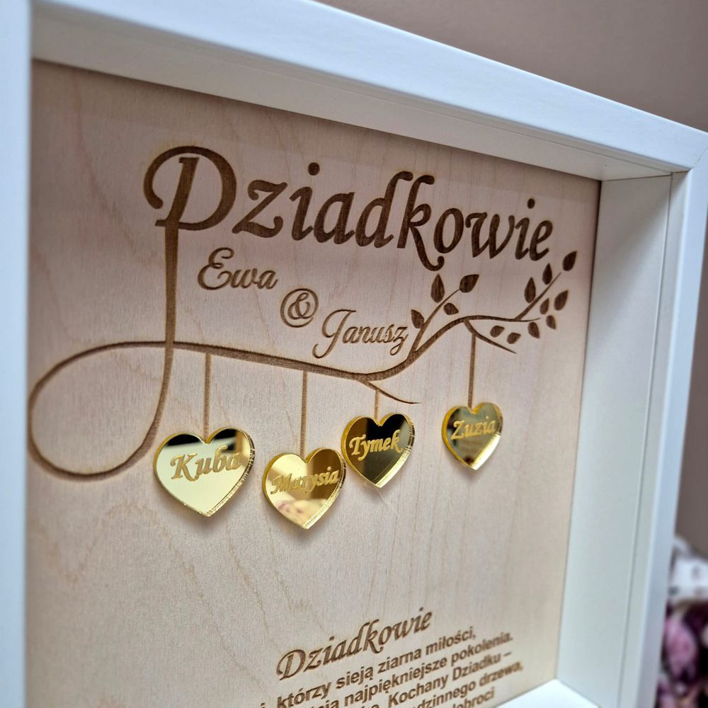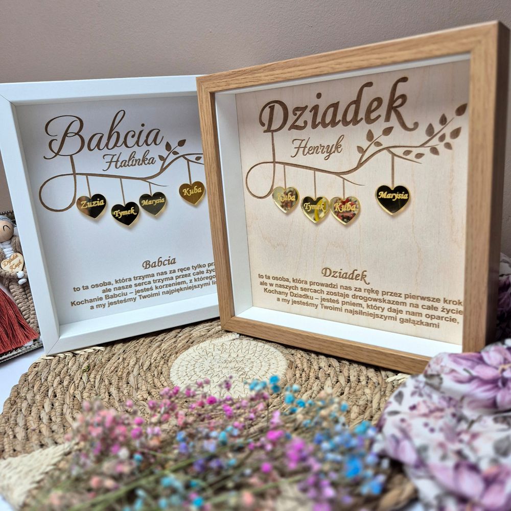 Ramka 3D z personalizacją dla Babci i Dziadka – grawer + złote serduszka z imionami wnuków