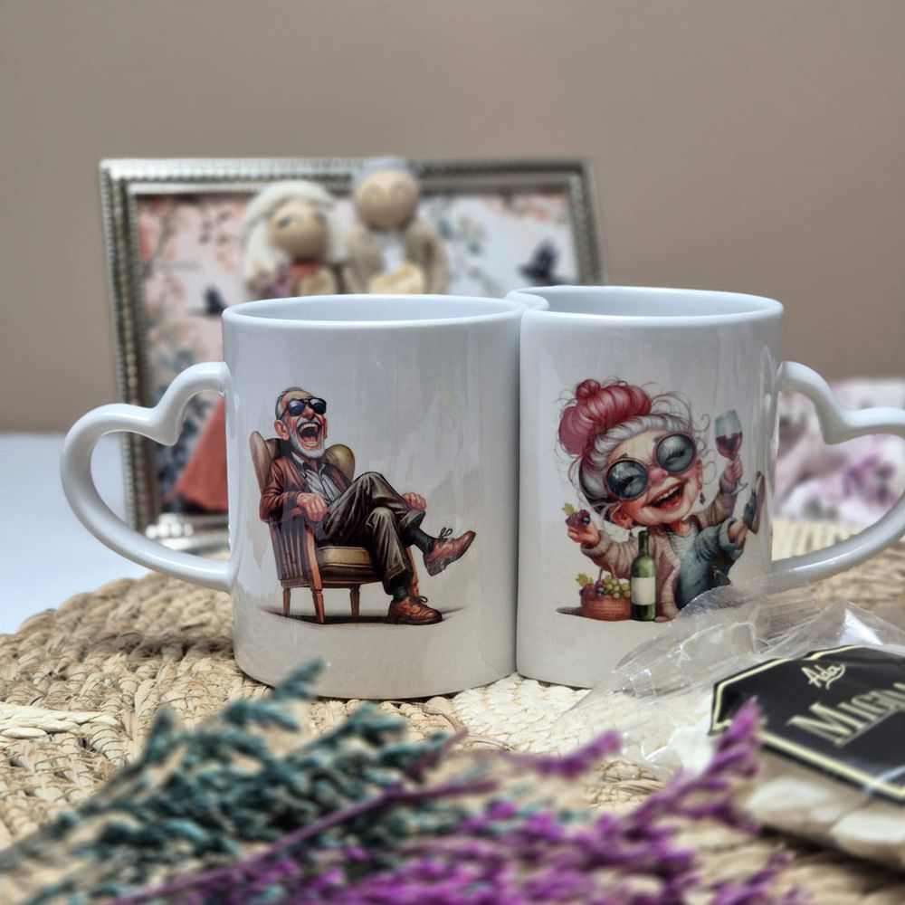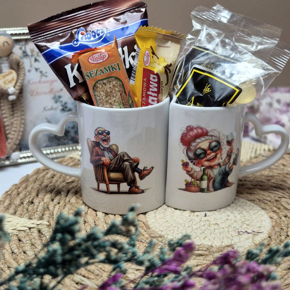 Zestaw dwóch połączonych kubków dla Babci i Dziadka z urocznymi, humorystycznymi grafikami. Idealny prezent na Dzień Babci i Dziadka, rocznicę lub inną wyjątkową okazję ❤️
