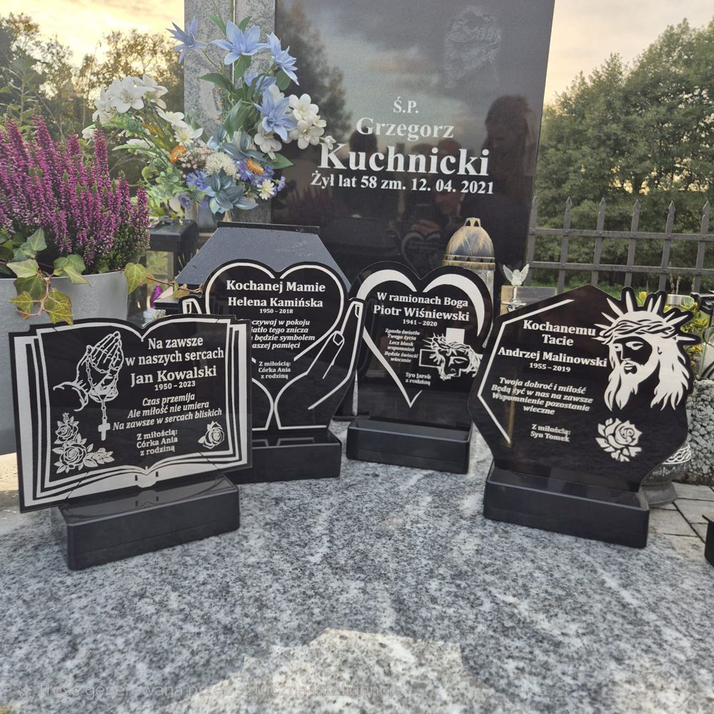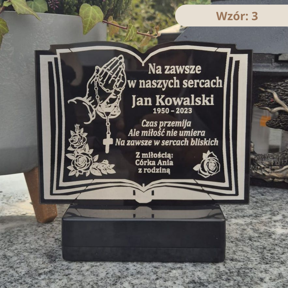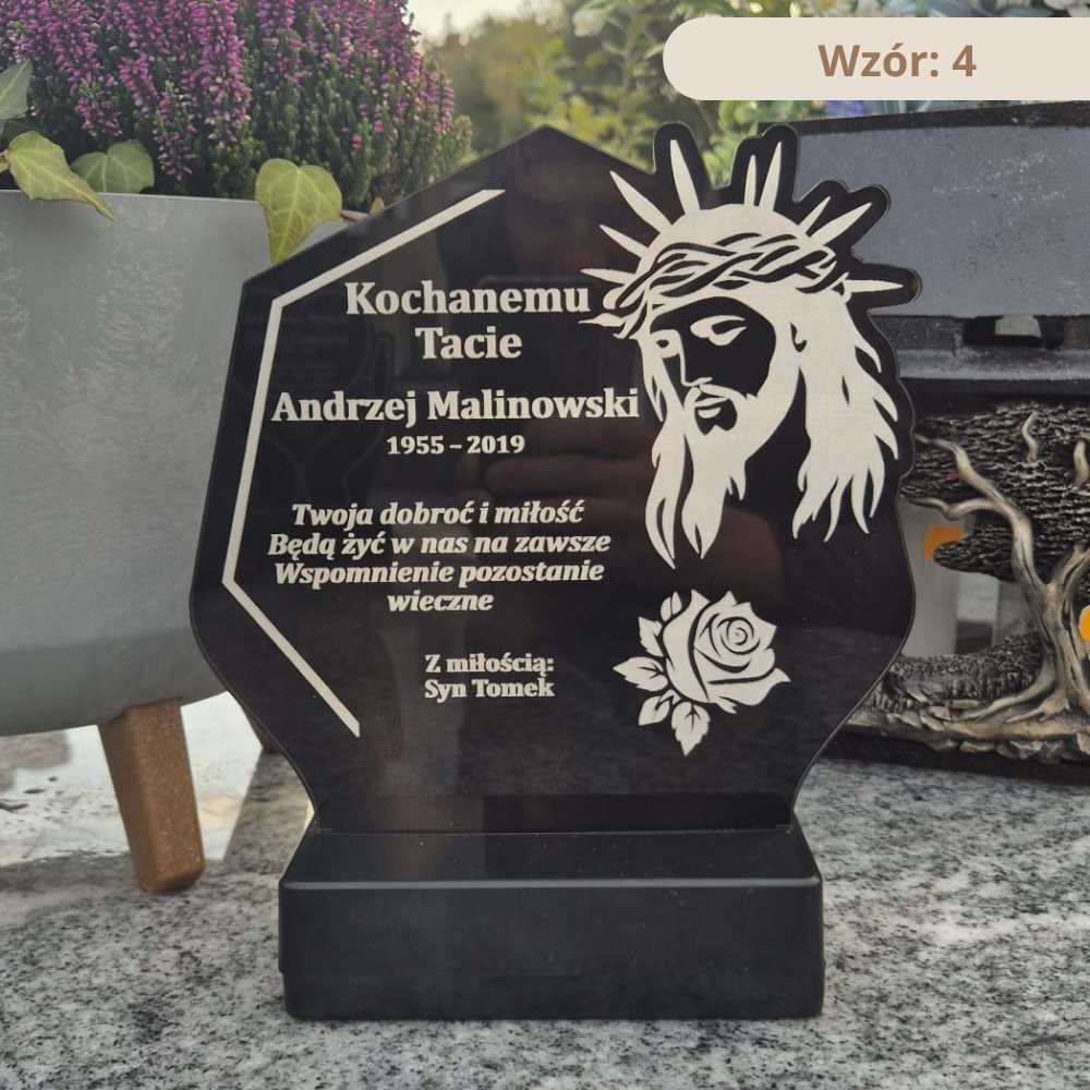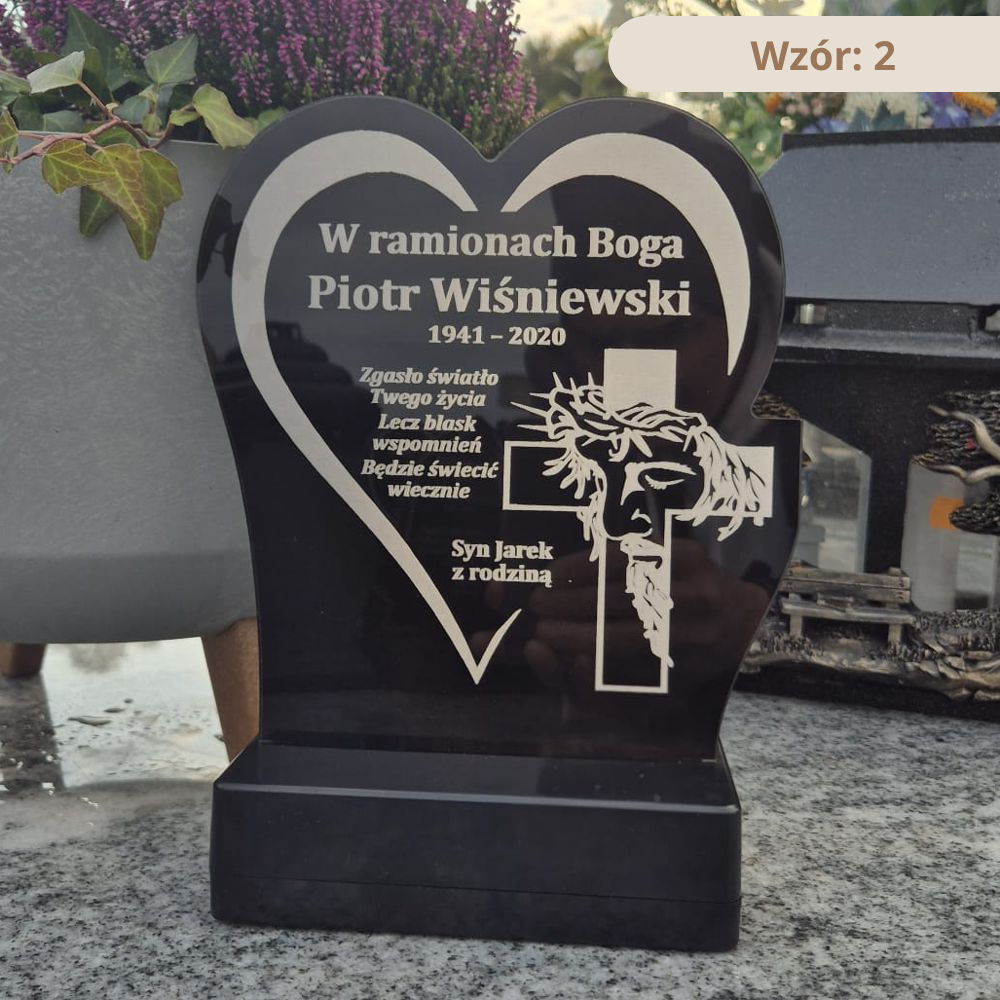 Personalizowany znicz nagrobny (25 lub 30 cm) z plexi 5 mm, konstrukcją wodoodporną i obciążoną podstawą. Grawer imienia / daty / dedykacji.